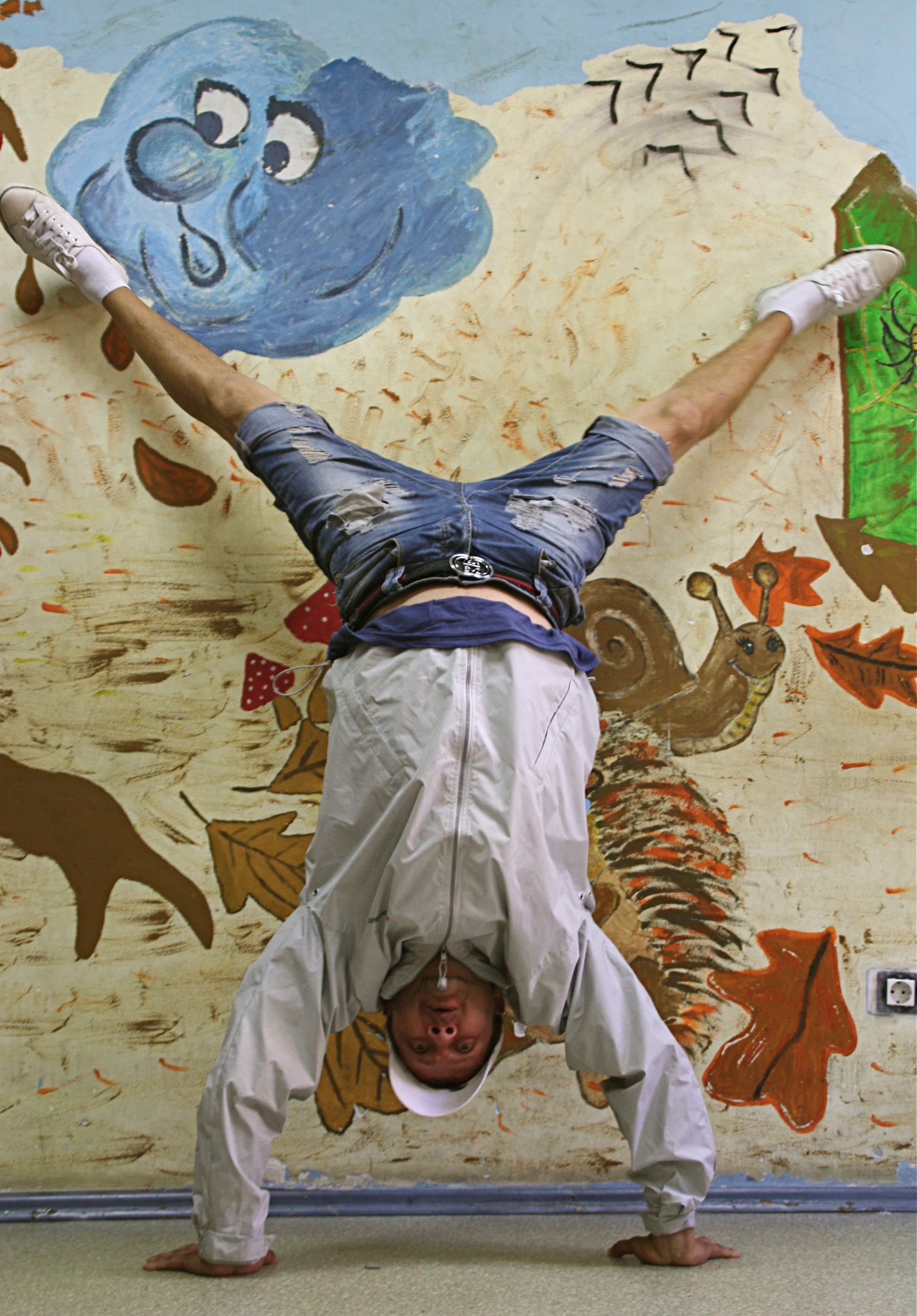 He lies face-down, close to the carpet, held up by his bent arms. Turning to the left, he makes the first two or three moves of a breakdancing spin. Getting up, against a mural of a countryside scene, he stands on his head, his face red and strained, but after a few seconds, he eases himself down. Standing up again, he throws three skittles into the air, which propel for a few turns, before falling to the ground.