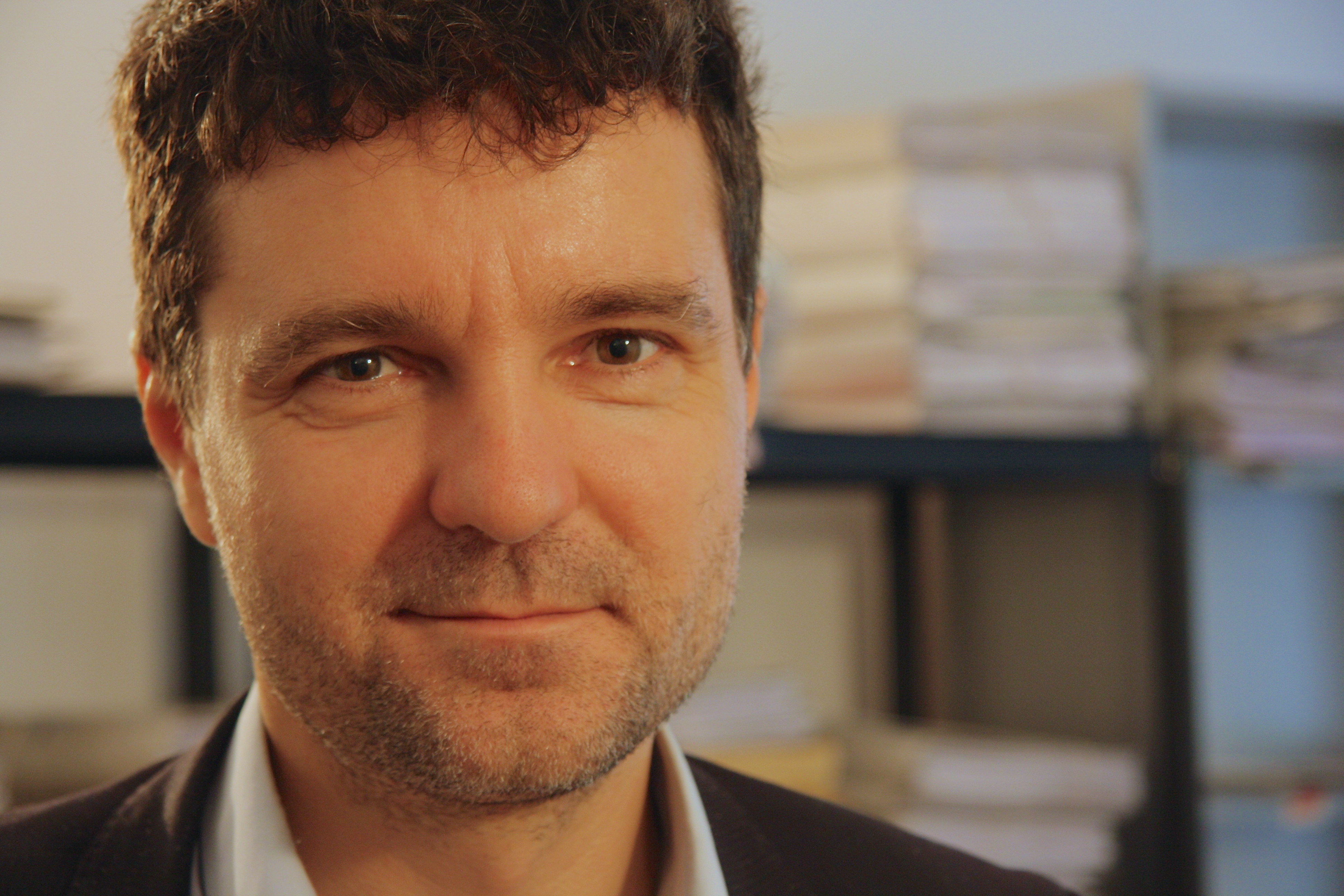 Standing behind 45 year-old doctor in maths Nicusor Dan is a wire shelf piled with hundreds of loose leaved files and cardboard folders.
