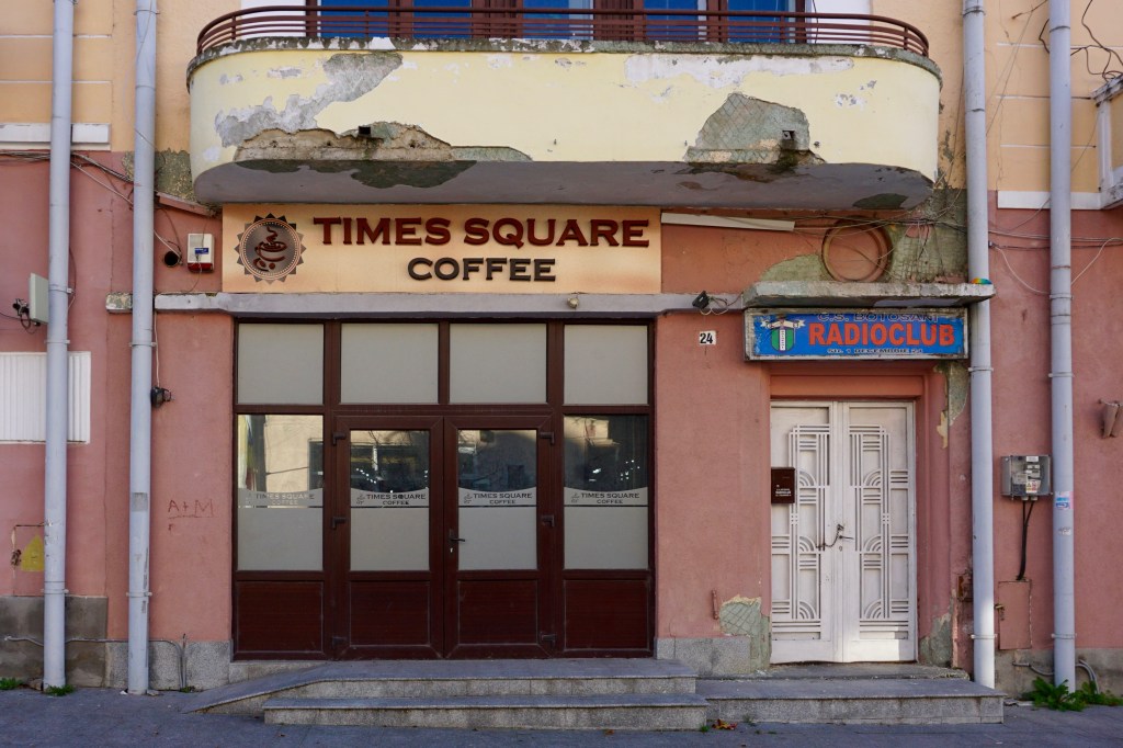 The historic center is built around a wide square, named after Romania’s national day of unification — 1 Decembrie 1918 —, which is empty of shops, and of tourists. A single cafe is open, as well as an information center, and one clothing store. On the cobbled streets of terraces is a 19th century mix of the baroque and classical, alongside art deco, but most of their spaces are dark, leaving traces of businesses recently opened, and closed, such as ‘Times Square Coffee’, and the gutted rooms of the Social Democratic Party’s local headquarters.