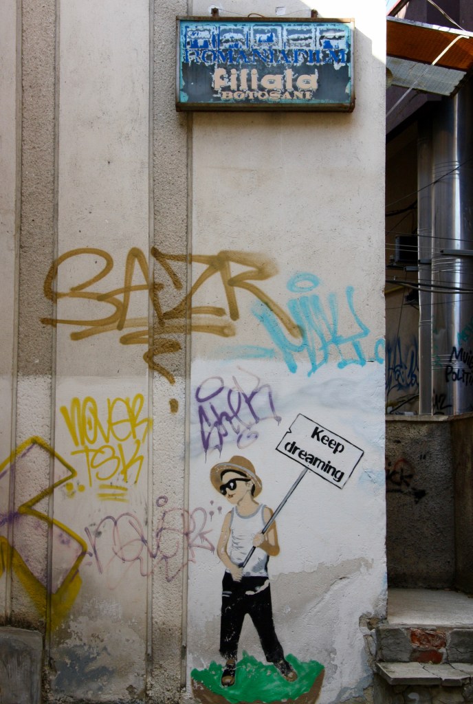 A tiny plaque nailed on the wall to the side of the prefecture commemorates Mugur Călinescu, who graffitied “Jos Comunismul” (Down with Communism!) in 1981 on this spot in blue chalk, when the building was the County HQ for the Communist Party. At this site, his damning words are not inscribed, or recreated. Instead there is only cracking plaster and this sign to his memory, where some of its letters are already worn, and fading out.
